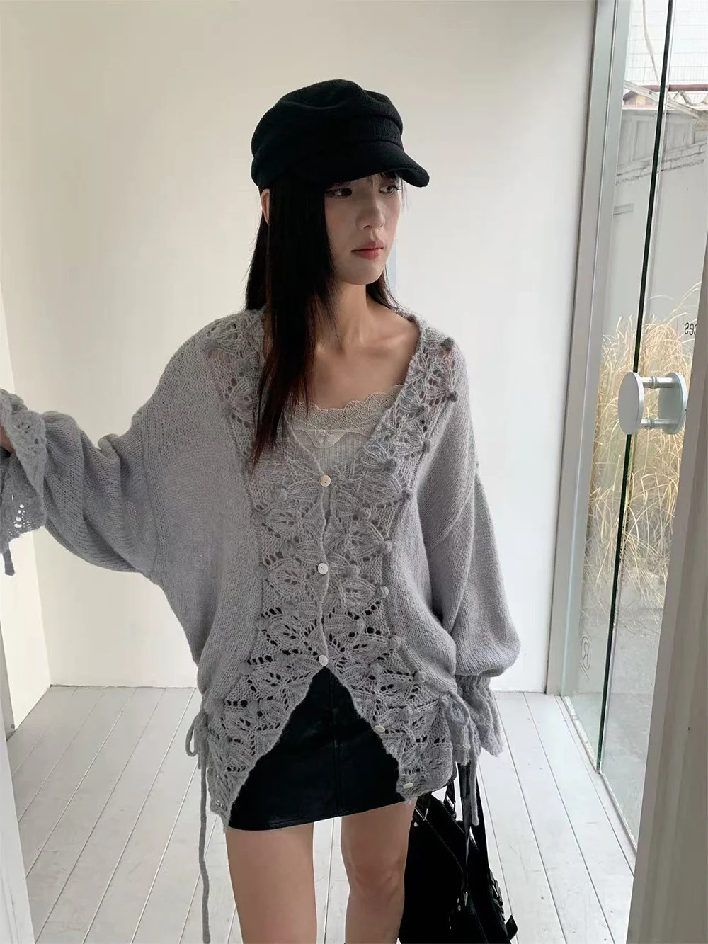 Laid-back style crocheted openwork knitted sweater for women, loose drawstring cardigan c1820